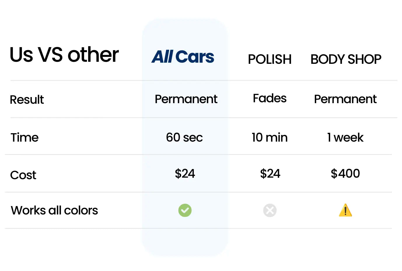 - Permanent scratch repair (survives rain & car washes)